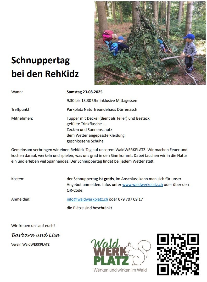Kosten: der Schnuppertag ist gratis, im Anschluss kann man sich für unser Angebot anmelden. Infos unter www.waldwerkplatz.ch oder über den QR-Code.